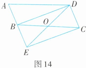 4. 如图14,将□ABCD的边AB延长至点E,使AB=BE,连接BD,DE,EC。DE交BC于点O。