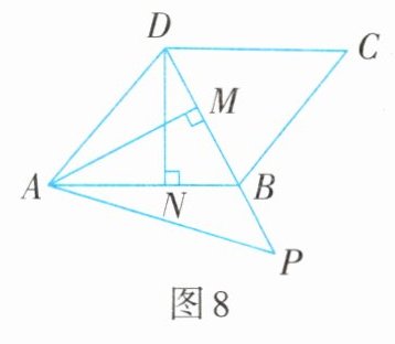 4. 如图8,在□ABCD中,连接BD,且BD=CD,过点A作AM⊥BD于点M,过点D作DN⊥AB于点N,且DN=3√2,在DB的延长线上取一点P,满足∠ABD=∠MAP+∠PAB,则AP=______.