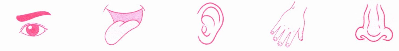 smell - 鼻子;see - 眼睛;hear - 耳朵;taste - 舌头;touch - 手