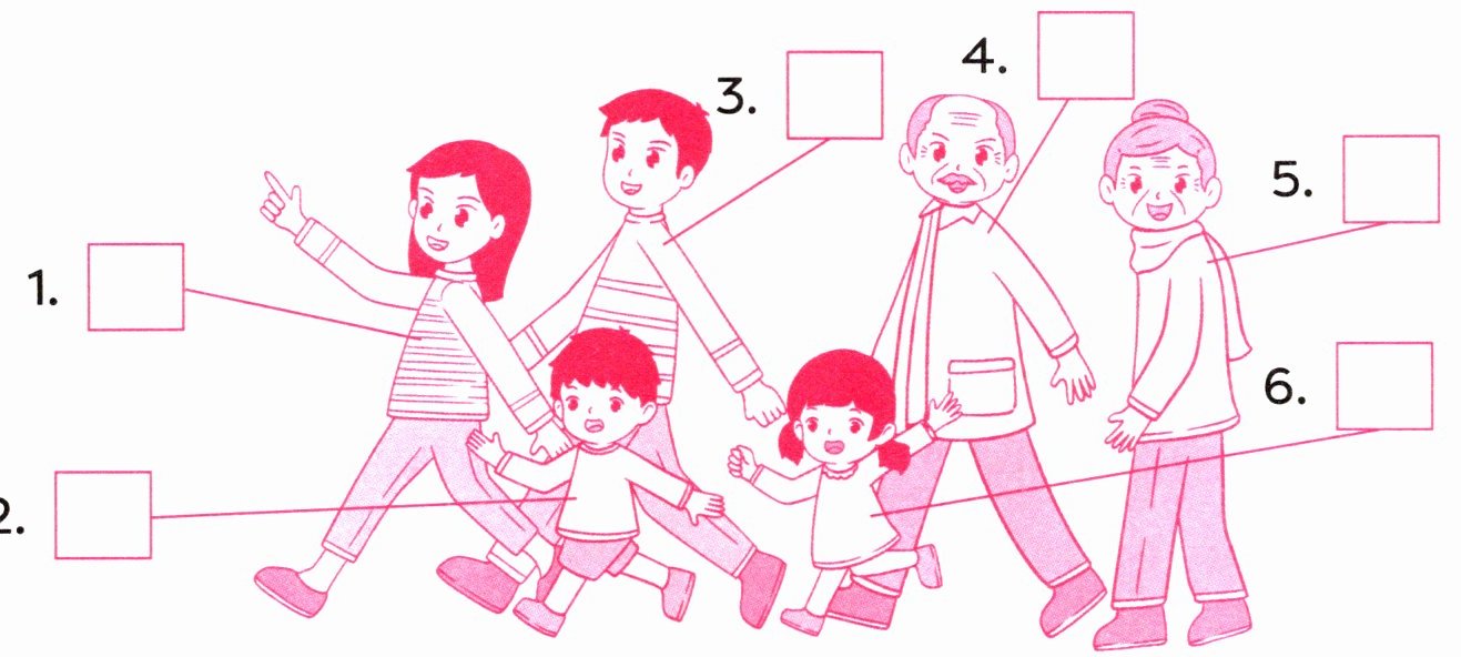 Ⅰ. 派对开始前,亮仔在介绍他的家人。看图选句子,并将序号填到方框里。