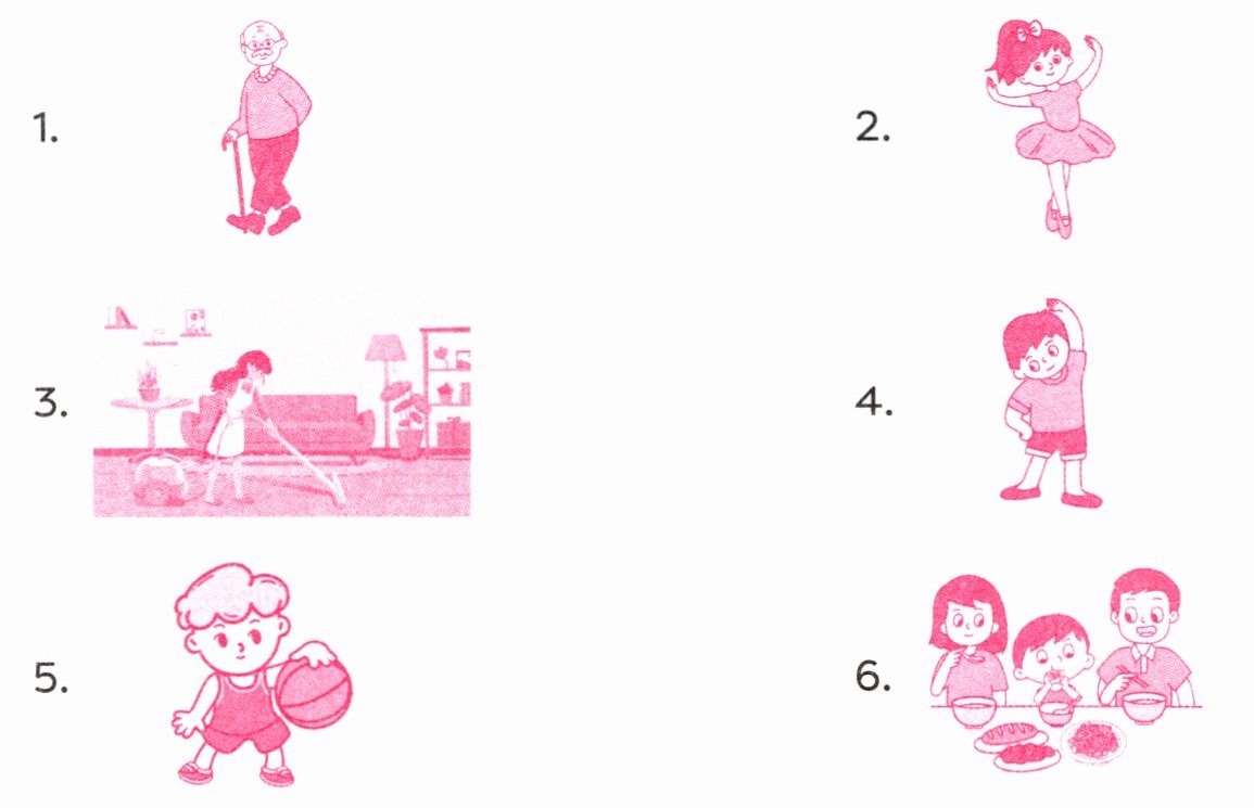 1. goes; walk 2. dancing; class 3. clean; room 4. morning; exercises 5. plays; basketball 6. eat; breakfast