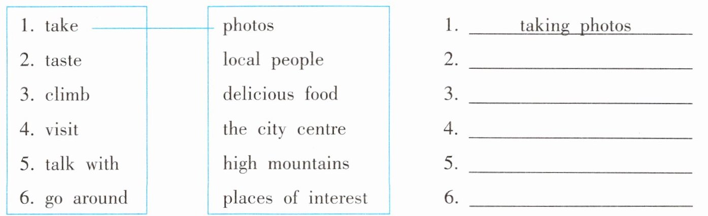 Ⅱ. 旅游要做哪些活动?将两个方框内的单词或词组配对,组成不同的活动。