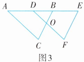 2. 如图3,平移$△ABC$可得到$△DEF$,若$∠A=50^{\circ },∠C=60^{\circ }$,则$∠E=$______$^{\circ }$,$∠EDF=$______$^{\circ }$,$∠F=$______$^{\circ }$,$∠DOB=$______$^{\circ }$。