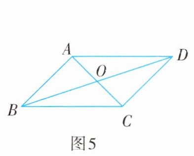 4. 如图5,$△ABC\cong △CDA$,BD交AC于点O,则$△ABC$绕点O旋转______度后与$△CDA$重合,$△ABO$可以由$△CDO$绕点______旋转______度得到。