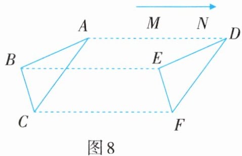 1. 如图8,$△ABC$沿MN方向平移3cm后得到$△DEF$。