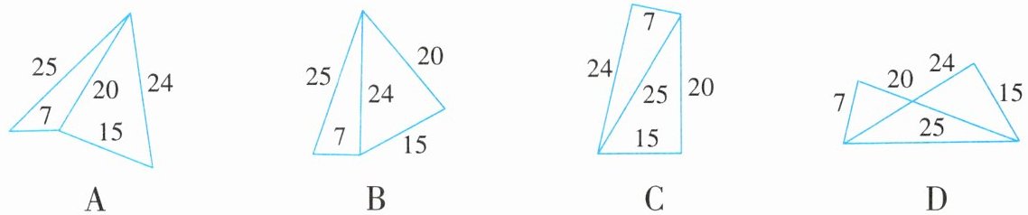 4. 五根小木棒的长度分别为7,15,20,24,25。现在想把它们摆成两个直角三角形,下图中正确的是( )。