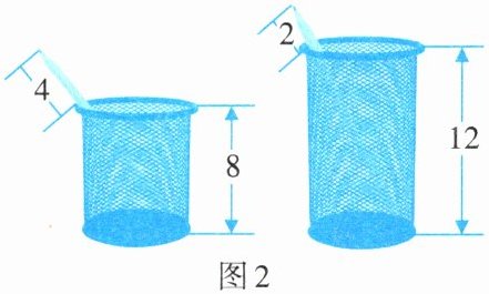 8. 如图2是两个型号的圆柱形笔筒,粗细相同,高度分别是8cm和12cm,将一支铅笔按如图所示的方式先后放入两个笔筒,铅笔露在笔筒外面的部分分别为4cm和2cm,则铅笔的长为( )。
