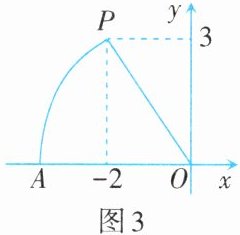 9. 如图3,在平面直角坐标系中,点P的坐标为$ (-2,3) $,以点O为圆心,以OP的长为半径画弧,交x轴的负半轴于点A,则点A的横坐标介于( )。