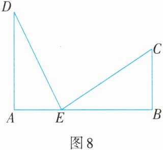 2. 如图8,铁路上$A$,$B$两点相距25km,$C$,$D$为两村庄,$DA⊥AB$于点$A$,$CB⊥AB$于点$B$,已知$DA = 15km$,$CB = 10km$。现在要在铁路线$AB$上建一个土特产收购站$E$,使得$C$,$D$两村到$E$站的距离相等,则$E$站应建在离$B$点多远处?