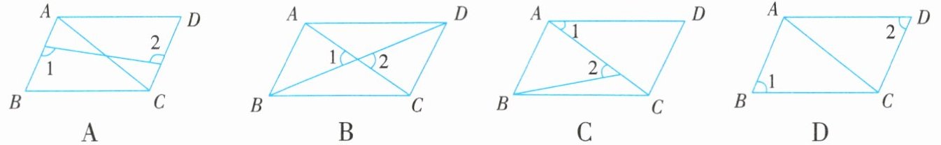 5. 已知四边形ABCD是平行四边形,则下列各图中∠1与∠2一定不相等的是( ).