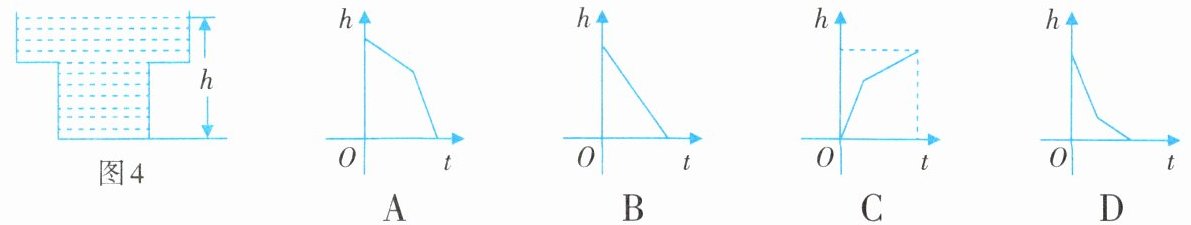10. 某蓄水池的横截面示意图如图4所示,分深水区和浅水区,如果这个注满水的蓄水池以固定的流量把水全部放出.下面的图象能大致表示水的深度h和放水时间t之间的关系的是( ).