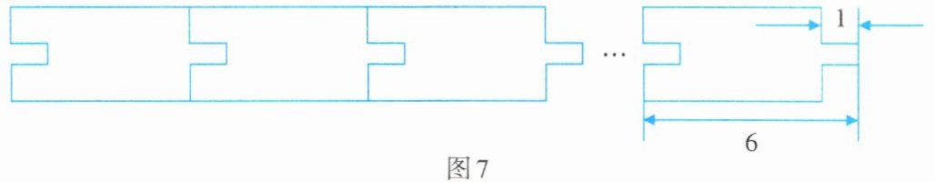 7. 中国古代有很多极为精巧的发明. 榫卯结构就是其中之一,它是在两个木构件上采用一种凹凸结合的连接方式. 如图7,已知一个木构件的长度为6,其凸出部分的长为1,若x个相同的木构件紧密拼成一列时,其总长度为y,则y关于x的关系式可以表示为______.