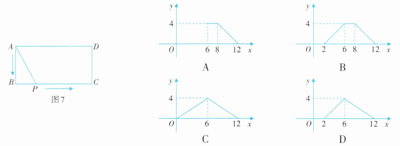 10. 如图7,在矩形$ABCD$中,$AB=2$,$BC=4$,点$P$为矩形边上的一个动点,运动路线是$A→B→C→D→A$.设点$P$经过的路程为$x$,以$A$,$P$,$B$为顶点的三角形的面积为$y$,则下列图象中能大致反映$y$与$x$的函数关系的是( ).