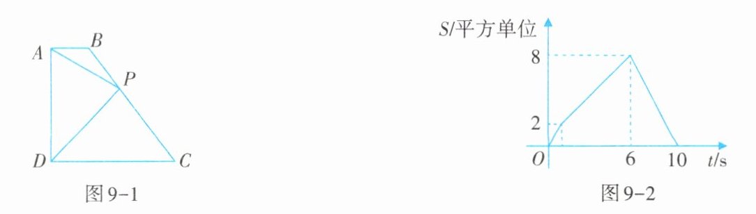 8. 如图9-1,在四边形$ABCD$中,$AB// CD$,$\angle ADC=90^{\circ}$,动点$P$从点$A$出发,以每秒$1$个单位长度的速度,按$A→B→C→D$的顺序在四边形边上匀速运动.设点$P$的运动时间为$t$,$\triangle PAD$的面积为$S$,$S$关于$t$的函数图象如图9-2所示,当点$P$运动到$BC$的中点时,$\triangle PAD$的面积为__________.