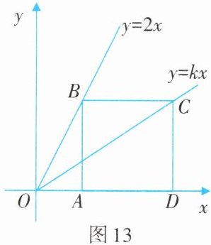 1. 如图13,点$B$,$C$分别在直线$y=2x$和直线$y=kx$上,点$A$,$D$分别是$x$轴上的两点.已知四边形$ABCD$是正方形,求$k$的值.