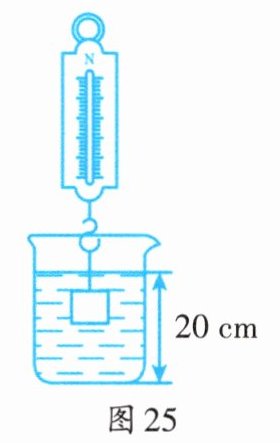 32. 如图25所示,放在水平桌面上的薄壁圆柱形容器重5N,底面积为100cm²,弹簧测力计的挂钩上挂着重为10N的物块,现将物块浸没在水中,容器内水面由12cm上升到20cm,g取10N/kg。求: