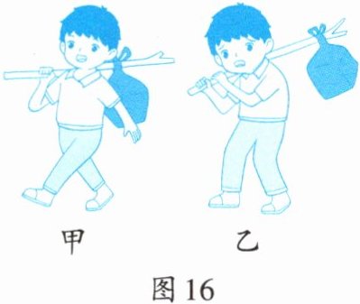 18. 某同学分别用图16所示的甲、乙两种方法挑着同一个物体行走,图甲中肩受到的压力______图乙中肩受到的压力;图甲中手施加的动力______图乙中手施加的动力。(均选填“大于”“等于”或“小于”)