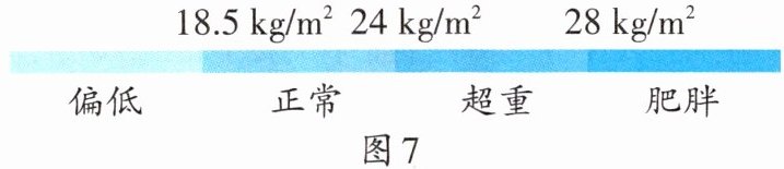 19. BMI是一个用于评估人体胖瘦和健康状态的简单指标。某运动员的身高为1.5m,质量为39kg,请你利用公式BMI=$\frac{m}{h^2}$计算该运动员的BMI数值(公式中质量以kg为单位,身高以m为单位)为__________kg/m²(保留一位小数),并对照以下标准(如图7所示数据)判断该运动员的BMI__________(选填“偏低”“正常”“超重”或“肥胖”)。