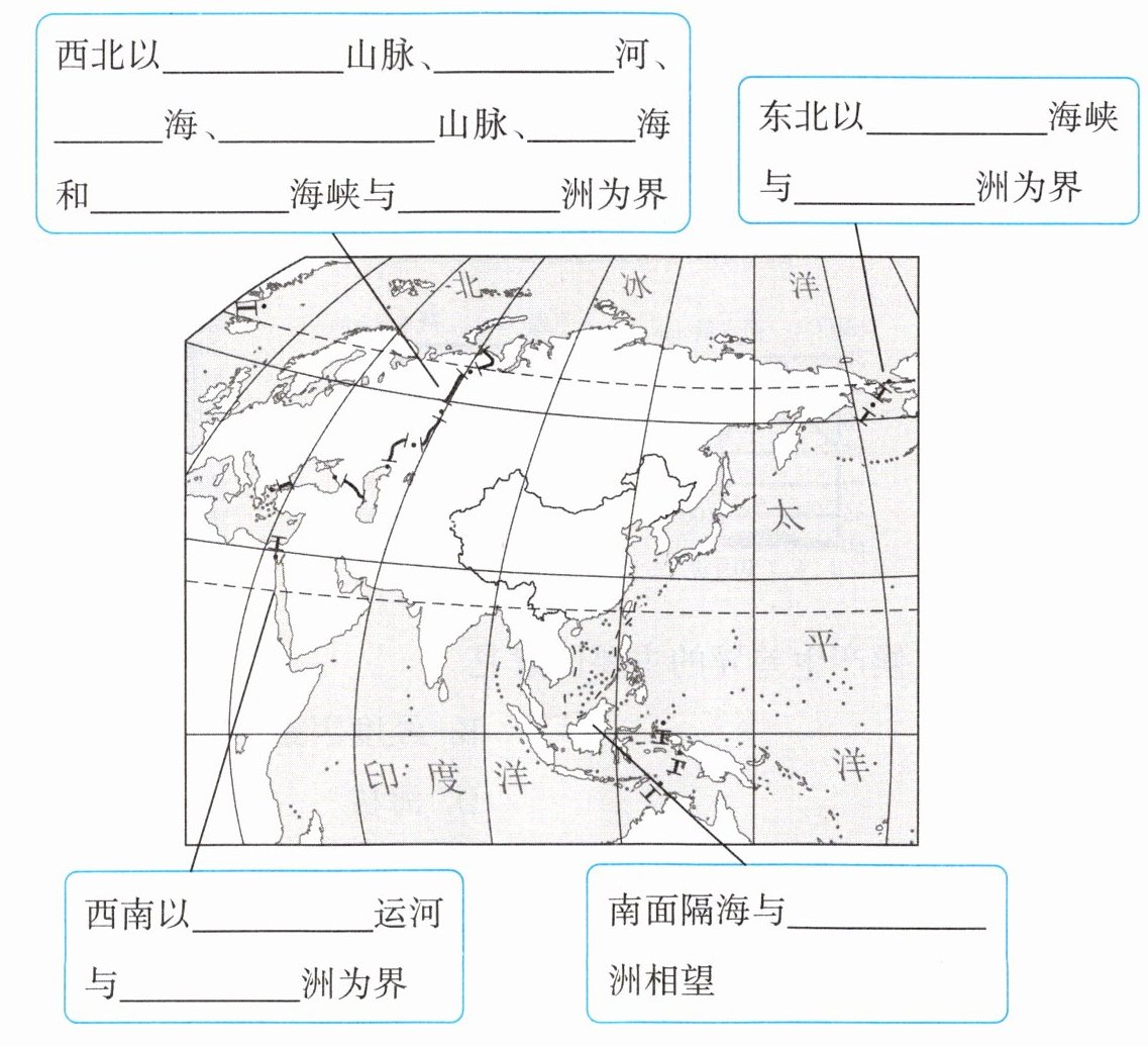 1. 填空,认识亚洲的范围与位置。