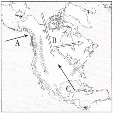 (3)图中B、C两股气流为什么能够畅通无阻地深入北美洲大陆中部?