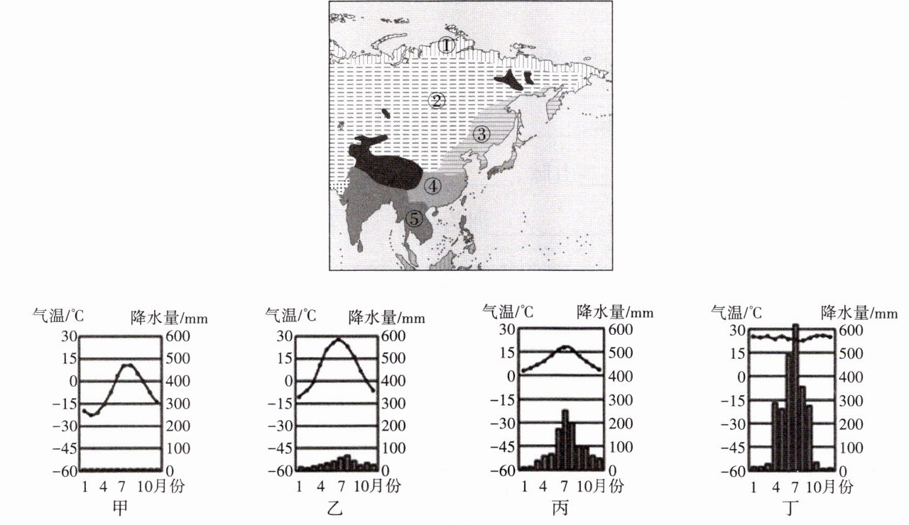 36. 甲、乙、丙、丁四种气候类型,与①②④⑤四地对应正确的是 ( )