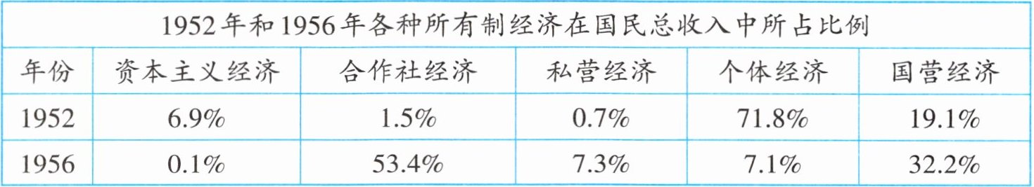 (3)原因:1956年公有制经济在国民总收入中占主导。联系:工业化建设为改造奠定物质基础;改造为工业化建设创造条件,相互促进。