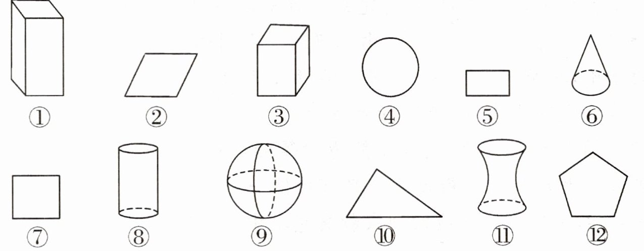 【解析】:平面图形是指存在于一个平面上的图形,立体图形是各部分不在同一平面内的几何图形。根据这个定义来判断,②是平行四边形,④是圆形,⑤是长方形,⑦是正方形,⑩是三角形,⑫是五边形,它们都在一个平面上,所以是平面图形;①是长方体,③是正方体,⑥是圆锥,⑧是圆柱,⑨是球,⑪是类似双曲面体(可看作立体图形),它们各部分不在同一平面内,所以是立体图形。
