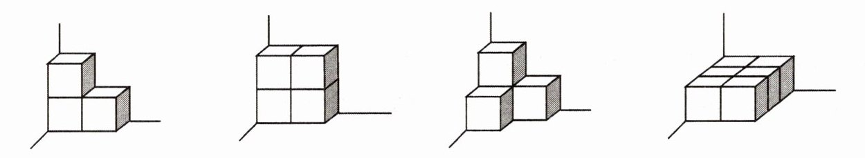一、数一数下面图形中各有多少个正方体的面露在外面,填在括号里。