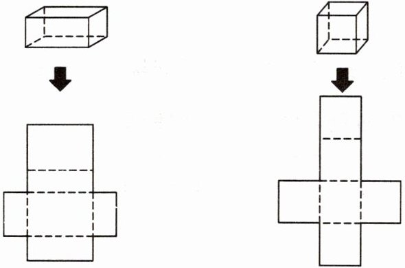 【答案】:(长方体展开图)中间较大长方形标“前”,其相对面标“后”,上面长方形标“上”,下面长方形标“下”,左右长方形分别标“左”“右”。(正方体展开图)任选一个面标“前”,其相对面标“后”,上面面标“上”,下面面标“下”,左右面分别标“左”“右”。