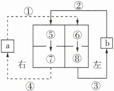 6. 如图是人体血液循环示意图。图中①~④表示与心脏相连的血管,⑤~⑧表示心脏中的四个腔,a、b表示两个毛细血管网。下列有关叙述正确的是(