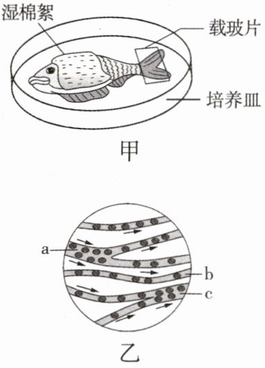 4. 如图甲为“观察小鱼尾鳍内血液流动”的实验中对材料的处理,图乙是用显微镜观察时看到的一个视野。下列有关该实验的描述,错误的是(