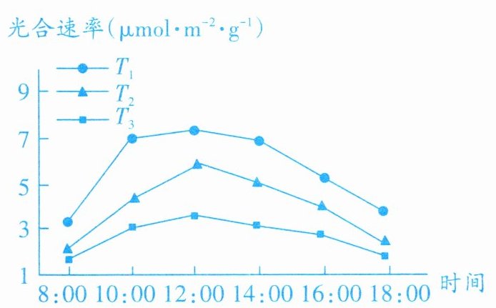 (2)据图可知,$T_{1}$、$T_{2}$、$T_{3}$三种土壤含水量条件下,黄瓜叶片的光合速率在8:00~12:00之间均______,12:00之后均逐渐降低。这种规律性变化主要是由于一天中______变化带来的影响。