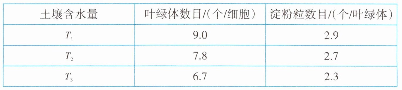 (3)从表格数据可知,土壤含水量$T_{1}>T_{2}>T_{3}$,随着土壤含水量的增加,叶绿体数目增多,说明土壤含水量增加可以促进黄瓜叶肉细胞中叶绿体的形成和发育,叶片的光合作用速率上升,淀粉粒数目增加。