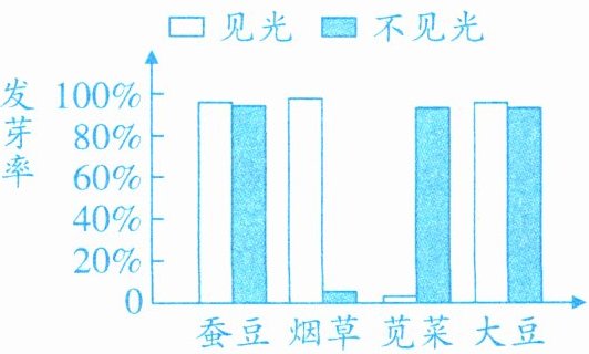 根据图表信息,蚕豆种子见光条件下发芽率略高于不见光条件,烟草种子在见光条件下发芽率远远高于不见光条件,苋菜种子在不见光条件下发芽率远远高于见光条件,大豆种子在见光和不见光条件下发芽率几乎相同。