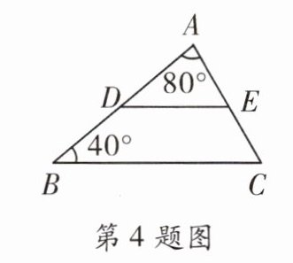 4. 如图,在$△ABC$中,$∠A=80^{\circ },∠B=40^{\circ }$,D、E 分别是 AB、AC 上的点,且$DE// BC$,则$∠AED$的度数为(