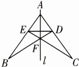 8. 如图,$△ADB$和$△AEC$关于直线$l$对称,有以下结论:①$AC$与$AB$是对应线段,所以$AC = AB$;②$DE$是$AF$的垂直平分线;③$AB$没有对应线段,点$A$没有对应点;④$∠BAF$与$∠CAF$是对应角,所以$∠BAF = ∠CAF$.其中,正确的说法有(
