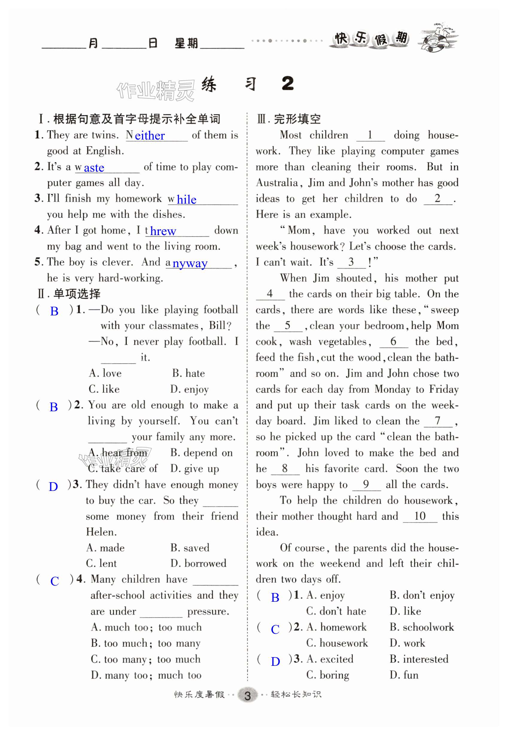 注:目前有些书本章节名称可能整理的还不是很完善,但都是按照顺序排列的,请同学们按照顺序仔细查找。练习册 2025年文涛书业假期作业快乐暑假八年级英语人教版 答案主要是用来给同学们做完题方便对答案用的,请勿直接抄袭。