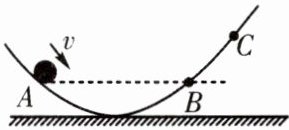 6. 如图所示,粗糙的弧形轨道竖直固定在水平地面上,小球由A点以速度v沿轨道滚下,经过另一侧等高点B后到达最高点C,下列分析正确的是(
