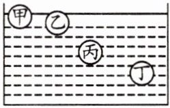 5. 甲、乙、丙、丁是四个体积、形状相同而材料不同的球,把它们投入水中静止后的情况如图所示,它们中所受浮力最小的是(