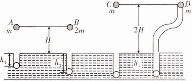 10. 某同学在体育活动中,从铅球下落陷入沙坑的深度情况猜想到:物体的重力势能可能与物体的质量、下落高度和运动路径有关,于是设计了如图所示的实验:用大小、形状相同的 A、B、C、D 四个铅球,其中 A、C、D 三球的质量为 m,B 球质量为 2m,让 A、B 两球从距沙表面高 H 静止下落,C 球从距沙表面高 2H 静止下落,D 球从距沙表面高 2H 的光滑弯曲管道上端静止滑入,最后从管道下端竖直地落下,(球在光滑管道中运动的能量损失不计)。实验测得 A、B 两球陷入沙深度分别为$h_{1}$和$h_{2}$,C、D 两球陷入沙深度均是$h_{3}$,且$h_{1}<h_{2}<h_{3}$。