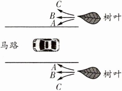 6. 我们经常看到这样的现象:在无风的天气,汽车在马路上快速驶过以后,马路两边的树叶会飘动。如图所示,汽车向左行驶,马路两边的树叶会沿着A、B、C哪一个方向飘动(