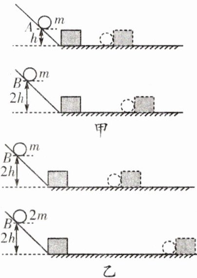 (1)让质量相同的两个小球沿同一光滑斜面分别从A处和B处开始向下运动,然后与放在水平面上的纸盒相碰,纸盒在水平面上移动一段距离后静止,如图甲所示。