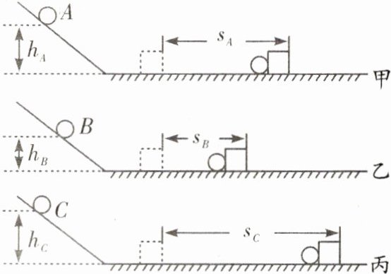 10. 为了模拟研究汽车超载和超速带来的安全隐患,小谢同学设计了如图所示的探究实验:将A、B、C三个小球先后从同一装置、高分别为$h_{A}$、$h_{B}$、$h_{C}$的位置滚下($m_{A}=m_{B}<m_{C}$,$h_{A}=h_{C}>h_{B}$),推动小木块运动一段距离后静止。请你根据生活经验和所学的物理探究方法,回答以下问题:
