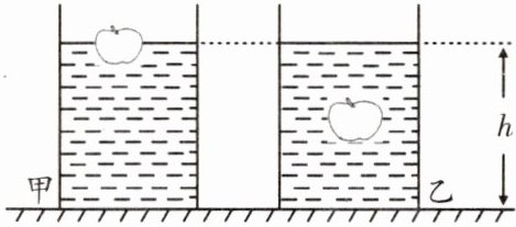 6. 水平桌面上有甲、乙两个完全相同的容器,甲容器内盛有适量的 $ A $ 液体,乙容器内盛有适量的 $ B $ 液体。将同一个苹果先后放入甲、乙两个容器中,苹果静止后的浮沉状况及液体的深度如图所示,对图中情景分析正确的是 (