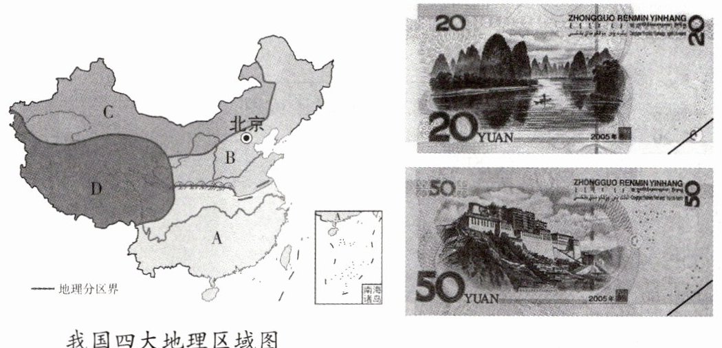1.读我国四大地理区域图和20元、50元人民币背面图,回答下列问题。