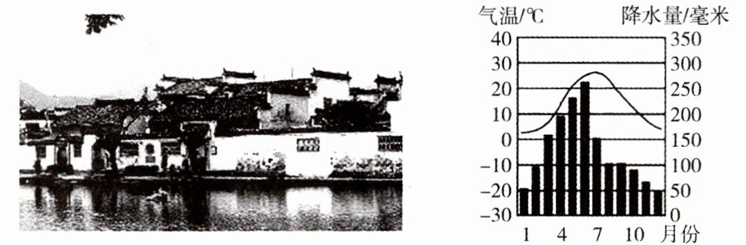 位于群山中的皖南古村落,建筑风格和村落形式独具美感,被誉为“中国画里的乡村”。下面是皖南古村落景观图及当地气候统计图,据此完成5、6题。