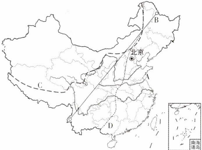 2.图中A、B、C、D是我国四条重要的地理分界线,据此回答下列问题。