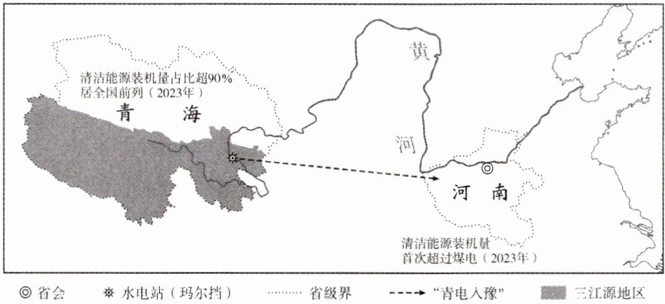 “青电入豫”工程一头牵着清洁能源丰富的青海省,一头连着能源需求巨大的河南省,被誉为输送清洁能源的“高速公路”。下图为青海省、河南省位置示意图。
