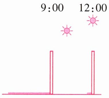 小明在操场上做影子观察实验。上午9点,他记录了阳光下竿子的影子的位置和长度;中午12点再次记录影子的位置和长度。
