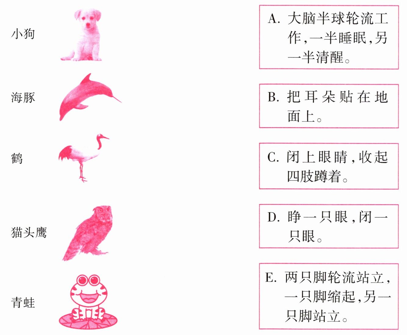 小狗——B;海豚——A;鹤——E;猫头鹰——D;青蛙——C。